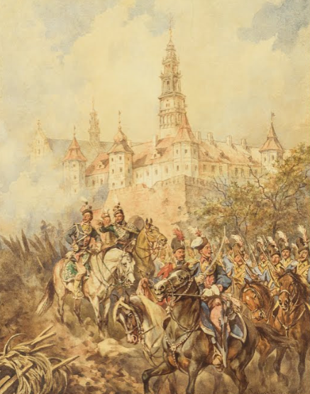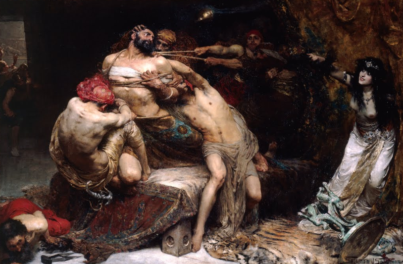 From left to right image: Alexander the Great founding Alexandria by Placido Costanzi (1736-1737) Baroque; Napoleon Crossing the Alps (Napoleon at the Saint-Bernard Pass) by Jacques-Louis David (1801); Knight at the Crossroads by Viktor Vasnetsov in Russia (1882); Pułaski at Częstochowa (Episode from Bar Confederation times) by Juliusz Kossak (1877); Samson by Solomon Joseph Solomon (1887)