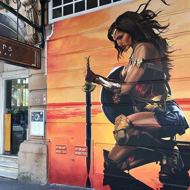 From left to right image: George the Victorious by Thiago Mazza in Rusia (2016); Remembering a Forgotten Hero by Keir Johnston and Willis “Nomo” Humphrey_Philadelphia, PA (2018); _John Lewis Hero Mural by Sean Schwab in Atlanta, Georgia; Wonderwoman Mural in Sydney, Australia
